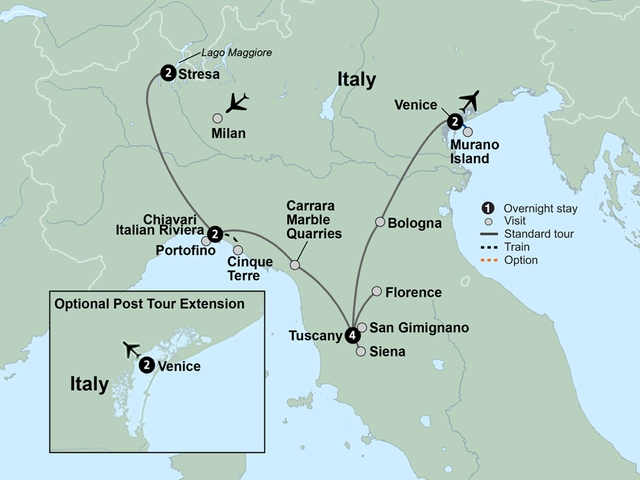 Vineyards, olive groves, and cities that float. Incredible history, indelible culture, and unforgettable cuisine. This is l’Italia at its most iconic. Enjoy the natural beauty and calm of the Alpine Lakes region. Snake along the edge of the sea to the medieval villages of Cinque Terre. Aboard off-road vehicles, explore the marble quarries of Carrara, where Michelangelo obtained the marble for his statue of David. Relax during a leisurely 4-night stay at a Tuscan villa. At a family-owned villa, learn the fine art of creating Tuscan cuisine during a hands-on cooking class. Explore Florence, the birthplace of the Renaissance. Discover Venice, a city of winding canals and bridges. From medieval masterpieces to bustling piazzas, be swept away by the legendary treasures of northern Italy.