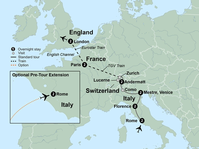 Set your sights on the European journey of a lifetime and discover all the must-sees of England, France, Switzerland and Italy. See the incredible sites of London, from Buckingham Palace to Big Ben. Take the Eurostar train to Paris and personalize your stay by touring the “City of Lights” on a relaxed panoramic drive or on a walking tour of the hilltop Montmartre district. Take in breathtaking views from your dinner table aboard a Parisian river boat. Board a high-speed train bound for Lucerne, the enchanting Swiss city on a cobalt lake and one of Switzerland’s most beautiful places. In Venice, discover a floating city where iconic landmarks of centuries-old history line canals dotted with gondolas. Tour Florence, the “Cradle of the Renaissance.” Finally, in Rome, bask in cultural treasures and envelop yourself in the history of the “Eternal City,” which includes a visit to the Sistine Chapel. Storied history, mouthwatering cuisine and iconic landscapes await.